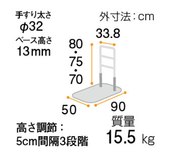 ●サイズ:ベース:50×90cm、高さ70〜80cm(5cm間隔3段階) ●重さ:約15.5kg ●材質 手すり:プラスチック被覆スチールパイプ 手すりジョイント:プラスチック ベース:スチール、ゴム(縁) ●耐荷重:垂直荷重:60kg 水平荷重:45kg *置くだけタイプで移動もらくらく。