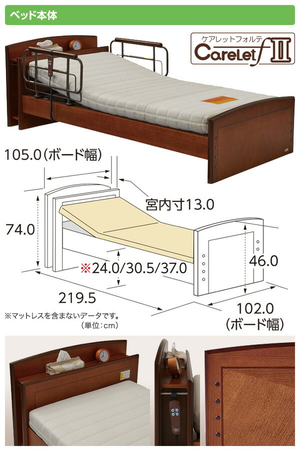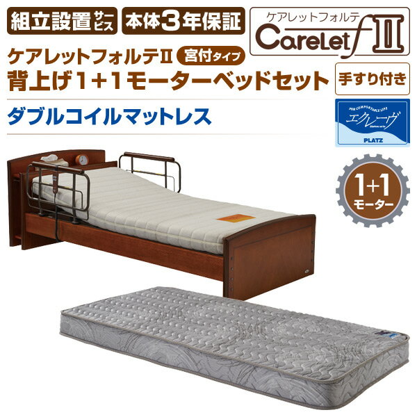 Platz/プラッツ ケアレットフォルテ 背上げ1+1モーターベッドセット (宮付・ダブルコイルマットレス) 手すり付き P201-5KBB-PM04S 本体サイズ 幅105×奥行219.5×高さ74cm 重量115.5kg 材質 ベースフレーム部:スチール、木部:中密度繊維板/天然木突き板/ポリウレタン樹脂塗装、マットレス貼り地:ポリエステル、マットレス中材:コイルスプリング/消臭綿(キュートリー)/ポリエステル/ウレタンフォーム、サイドレール:スチール/天然木/ポリウレタン樹脂塗装 仕様 ●原産国:本体:中国 木部:ベトナム マットレス:中国 商品説明 ●プラッツの自立支援電動ベッド、マットレス&サイドレール(手すり)セット販売●ボード表面は天然木の突き板「矢貼り」仕上げ●小物も置ける宮付きタイプ●ベッド上での姿勢を楽にする「電動ヘッドレスト」機能を搭載。