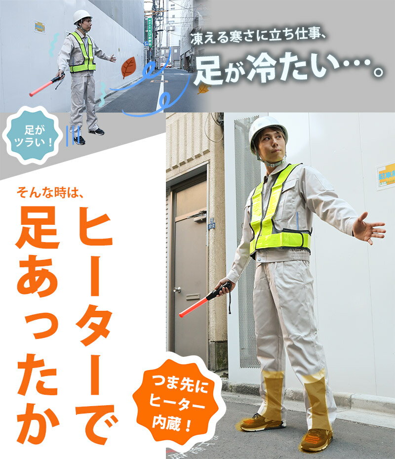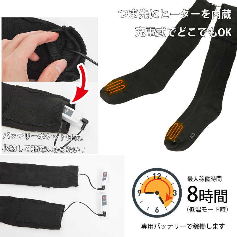 そんな悩みを解決するため、ソックスにヒーターを内蔵しました! ソックス自体が厚手であたたかく、長さはふくらはぎまでありますので冷たい外気をシャットアウト! 冷えやすいつま先は、ヒーターでパワフルにあたためます。